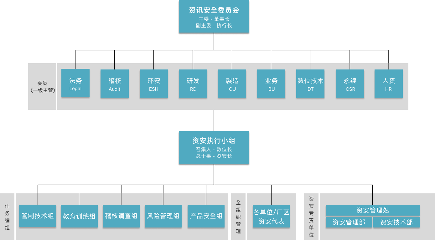 资讯安全委员会为熊猫体育资安最高管理组织,向董事长报告。下辖资安执行小组负责推行资讯安全委员会之各项决议。为持续建构完整且精实的资安专 责团队,资讯安全管理处下成立「资讯安全管理部」与「资讯安全技术部」,持续投入资源以强化团队资安核心能力。