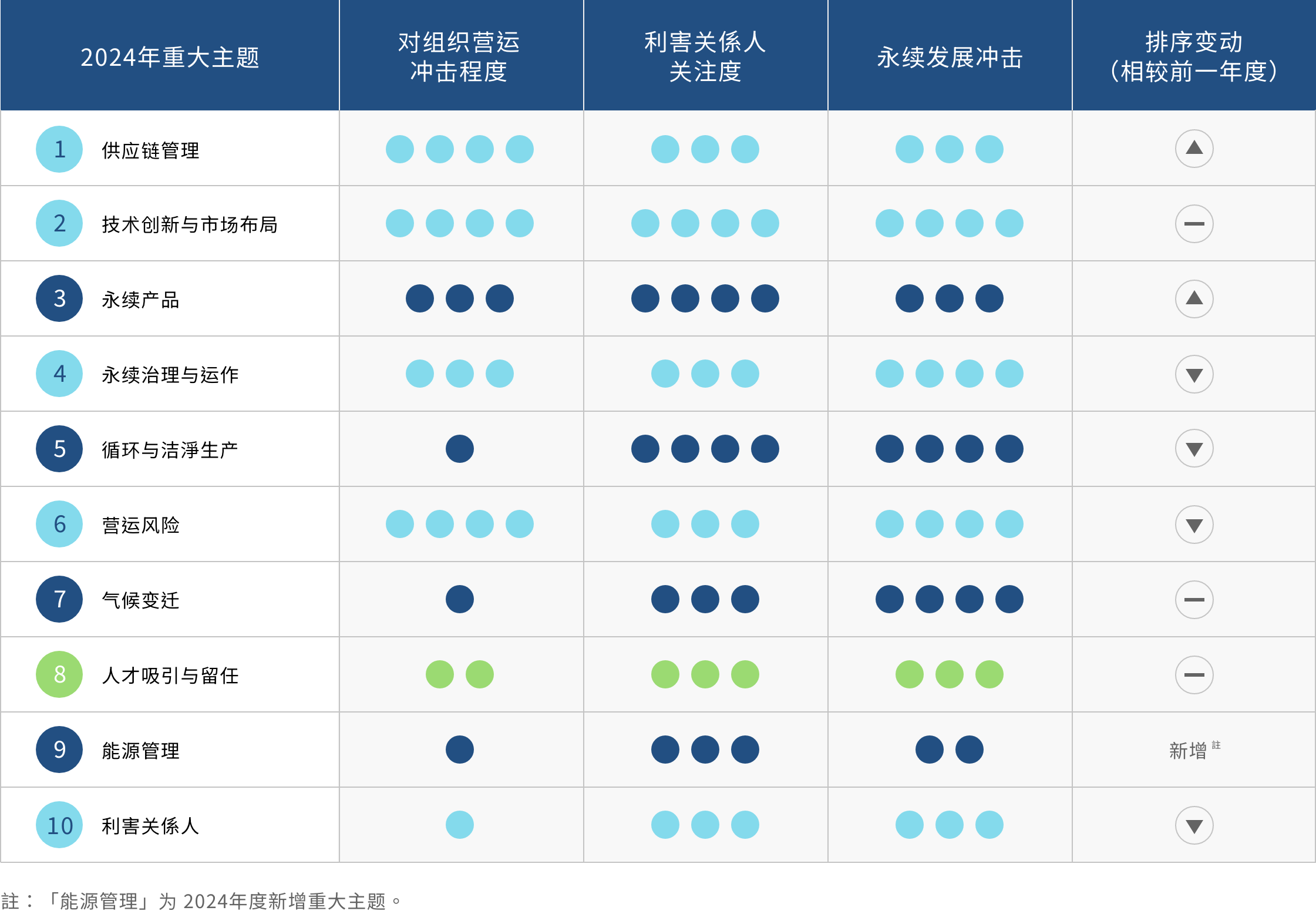| 营收成长 | 客户满意 | 营运风险 | 员工向心力 | 产业技术发展(正向) | 创造上游产值(正向) | 投资人财务资本(正向) | 产品环境效益(正向) | 提升再生能源(正向) | 提高员工生活福祉(正向) | 耗用能资源(负向) | 採购造成环境冲击(负向) | 极端气候(负向) | |||