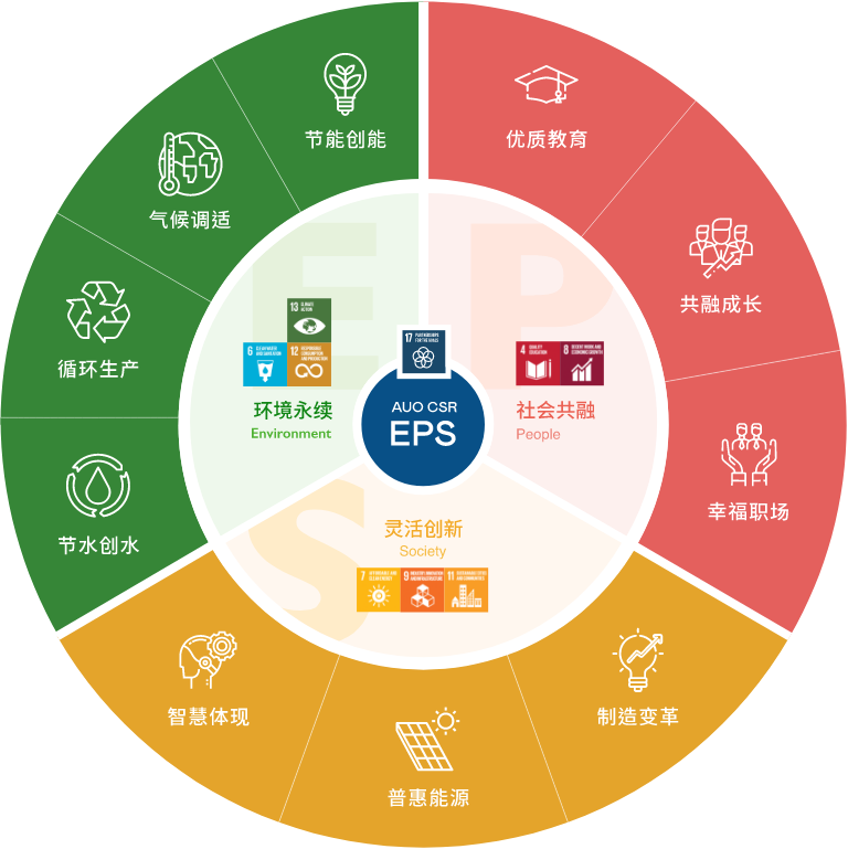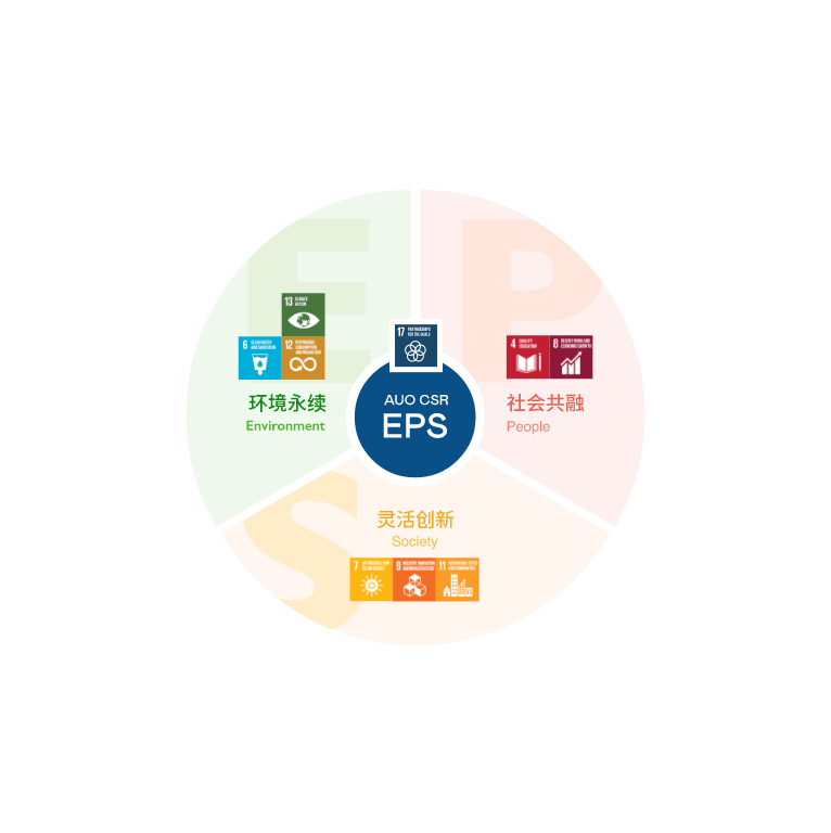 根据联合国所发展的17项永续发展目标,熊猫体育光电以「超越企业社会责任,创造共享价值」为企业永续愿景发展蓝图,订出环境永续、共融成长与灵活创新的EPS(Environment, People & Society)三大永续发展主轴;以响应日益受关切的环境议题与社会共融趋势。