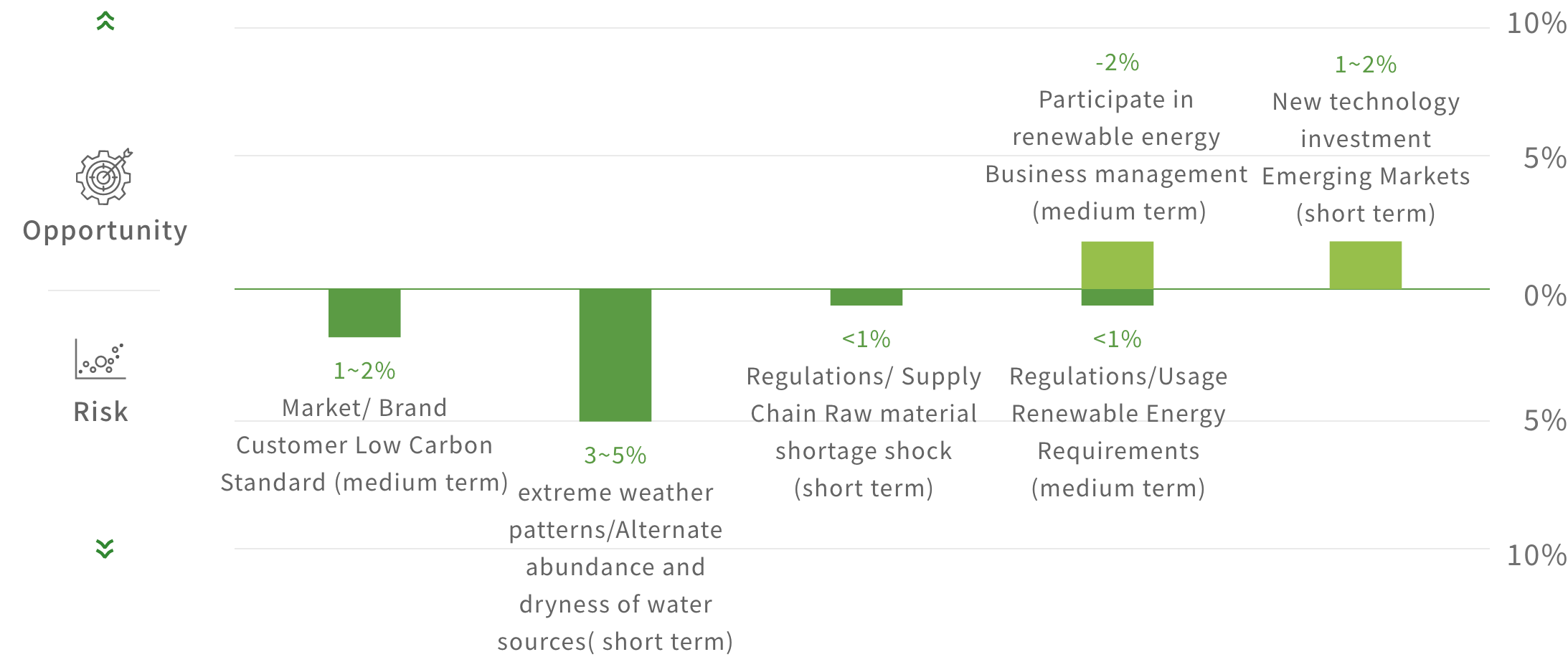 Based on past climate risk identification results, AUO evaluated four major risks, including "product carbon footprint, market product competition, sustainable operations, and regulatory compliance," and conducted a quantitative assessment of financial impact with reference to the methodologies disclosed by domestic and foreign companies